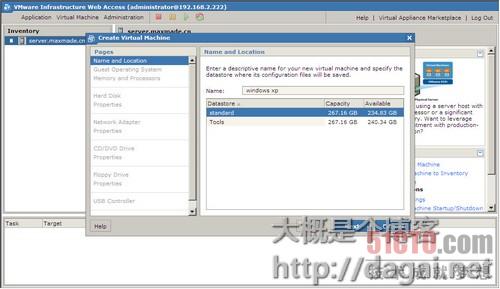 概要里显示了当前虚拟机的配置信息,需要注意的是这里有个Datastores,怎么翻译呢?数据仓库?在virutal server对应的功能应该是"搜索路径"吧,但VMware server里的datastores很显然跟virtual server的搜索路径不一样,比如指定一个光盘映像,在virtual server中不设置"搜索路径"可以直接输入绝对路径就可以了,而在VMware server不设置datastores使用绝对路径是无法使用的。这么理解吧,Vritual PC与VMware workstation使用光盘映像可以直接找到光盘位置使用就行了,但VMware server不是,所使用的映像必须是datastores里的,默认datastores里有个叫standard的datastore,至于怎么添加其他的路径到datastores里稍后再说。