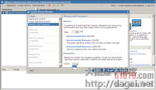 下面Processors是选择cpu的个数,必须主机是双核或超线程的处理器可选择两个以上CPU,否则只有一个,奇怪了,我主机是四核至强,这里怎么只有两个呢?