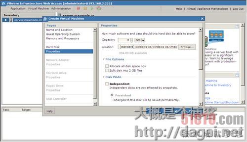 Options(文件选项),因为虚拟硬盘默认是动态的,也就是你创建的虚拟硬盘8GB,但系统不会立刻就创建一个8GB的虚拟文件,而是随着你的使用慢慢增大,最大到8GB,文件选项里第一个选项就是立刻分配磁盘空间,比如你创建一个虚拟硬盘8GB那么就立刻在主机硬盘里创建一个8GB的虚拟硬盘文件,这个在做群集的时候会提升一定性能。第二个选项是是否把虚拟硬盘文件分割成2GB一个的文件,这个选项不影响你虚拟机的使用,但跟主机有点关系,因为如果主机存放虚拟机虚拟硬盘的分区是FAT32格式,FAT32允许的最大单个文件大小是2GB,所以当如果你虚拟硬盘是动态的时候,你明明分的是8GB,但到2GB的时候你就会发现你虚拟机提示硬盘空间不够了,要注意哦,这里的这个文件分割成2GB大小就是针对这个来的,如果是主机磁盘是NTFS格式那就没所谓了。