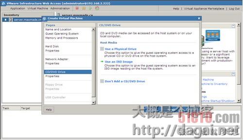 选择使用ISO光盘映像就要选择映像的位置,这个映像的位置必须是在Datastores里添加过的,否则没法使用,选择让光驱在系统启动的时候自动连接,再选择接口类型SCSI或IDE,默认IDE就行了,继续下一步,