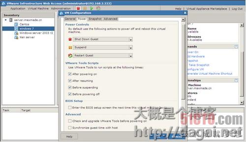 第一个是开机,第二个是添加硬件,如果你在添加完虚拟机后还想再增加硬件就在这里添加了,下面就是快照了,快照这个功能无需我多说了,Take Snapshot是创建一个快照。