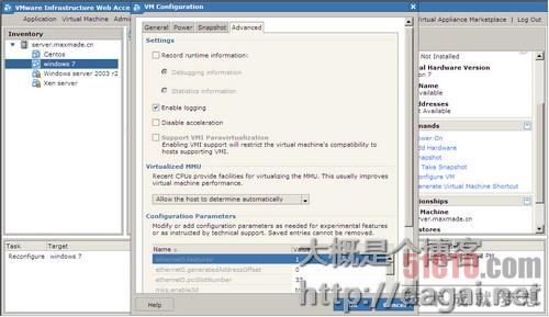 Unit),虚拟内存管理单元,说是有些新的CPU支持,老夫也不知道,三个选择,第一个是让虚拟机自动选择,第二个是当CPU支持的时候强制使用,第三个是不使用。最下面是配置参数,太他妈深奥了,老夫根本搞不清楚,可以添加或编辑这些参数,直接飘过。