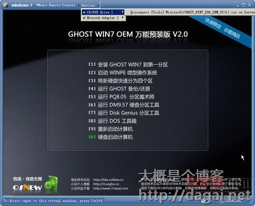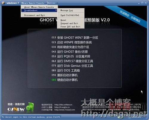设备菜单呢,还记得之前添加虚拟机硬件的时候,有些硬件有个选项是是否在启动的时候连接,这里就是控制这些设备连接和断开的。当然,每次虚拟机重新打开的时候,这些设备的连接状态还是你在设置虚拟机的时候选择的状态。左下角有一句话,这个是提示虚拟机鼠标独占和释放独占的快捷键,按Ctrl+G键,鼠标就被虚拟机独占了,这时鼠标只能在虚拟机范围内使用,如果要释放鼠标,按Ctrl+Alt键就行了,左右的都行,在安装完系统再安装了Vmware