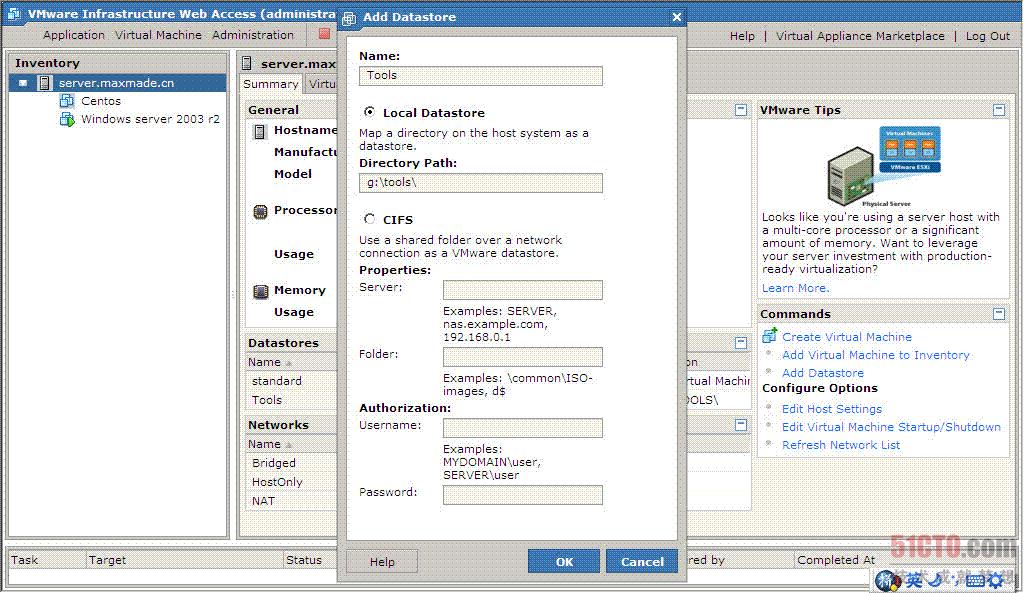 现在点Add Datastore来添加一个datastore,给添加的datastore取个名,第二行是添加本地的datastore,输入路径就行了,如果要添加网络上的datastore就要选择CIFS了,服务器、路径、用户名密码,很简单了