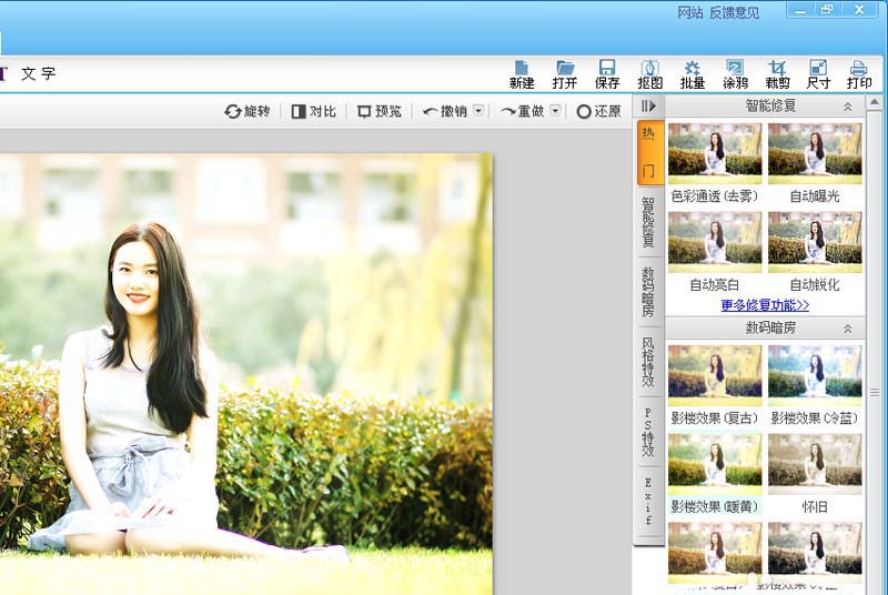 2、执行编辑-智能修复命令,选择数码暗房中的影楼效果(暖黄)。