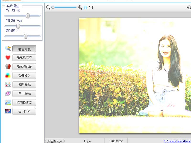 4、在照片调整中设置亮度为30,对比度为-25,饱和度为18.