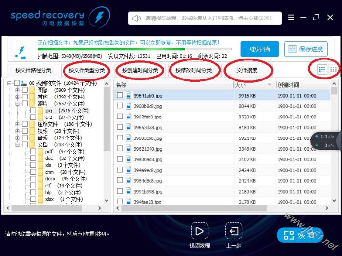 14、如果找不到删除的文件,或找到的文件太多。 您可以使用“按文件类型分类”、“按创建时间分类”、“按修改时间分类”查找删除的文件。 您也可以使用“文件搜索”功能查找删除的文件。 您也可以切换浏览模式,然后按文件名、文件大小、文件时间排序排序。 点击立即学习,如何找到需要恢复的文件。