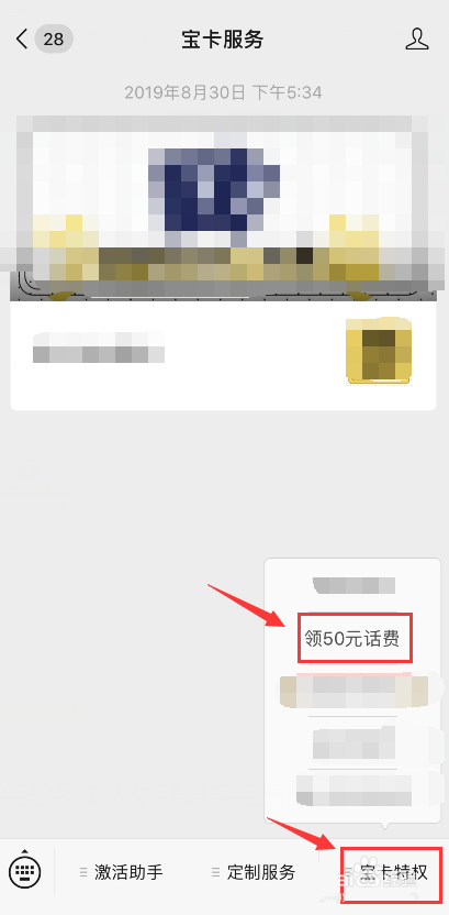 5、进入“宝卡助手”公众号,选择“宝卡特权”>>“领50元话费”;
