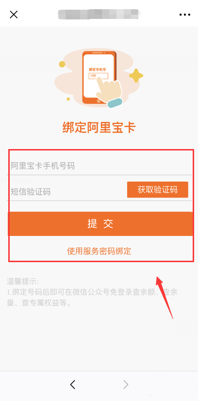 6、绑定蚂蚁宝卡,输入宝卡号码与短信验证码点击“提交”后,“领取”即可(虽然页面显示为“阿里宝卡”,但此福利同时面向蚂蚁宝卡用户)。