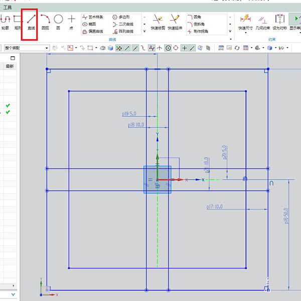 3、如下图所示,进入草图,激活矩形命令,随手画一个矩形,双击修改尺寸,100x100,边距离轴50,激活偏置曲线命令,向内偏移10。