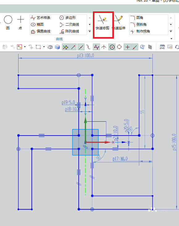 5、如下图所示,点击工具栏中的“快速修剪”,按照下图所示进行修剪操作,最后形成一个空心的“卐”,点击完成,退出草图。