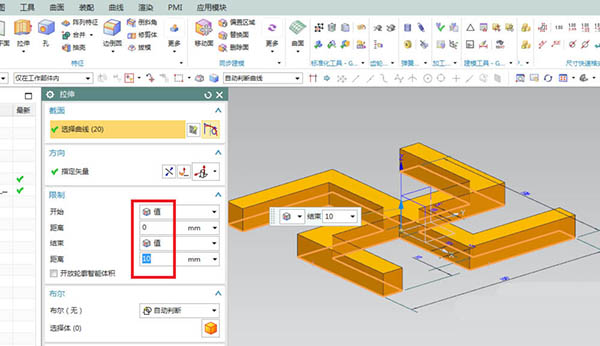 6、如下图所示,回到拉伸对话框,设置拉伸限制为:从0开始,到10结束。