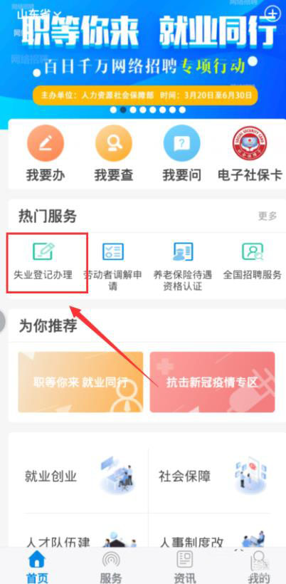 5、返回【掌上12333】首页点击【失业登记办理】按钮。