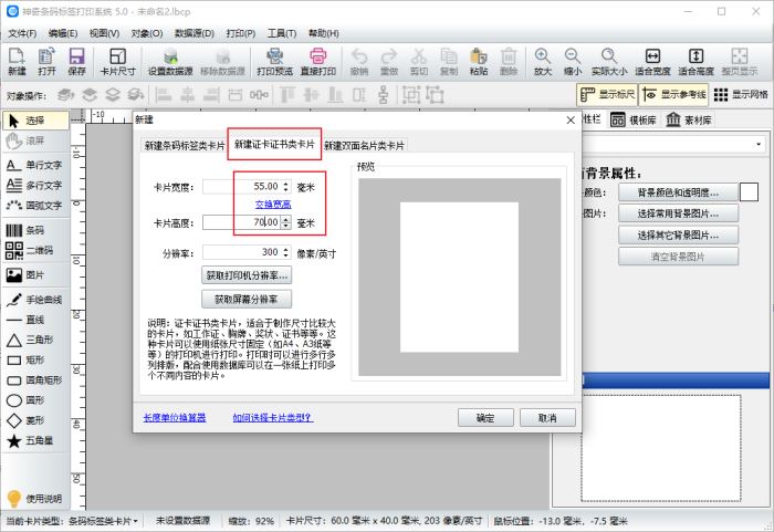 1、首先打开神奇条码标签软件,新建一个文件,因为我们做的是工作证,所以新建文件时需要选择证卡证书类文件。卡片的宽度和高度我们分别设置为55和70,您可以根据您的具体尺寸来设置。