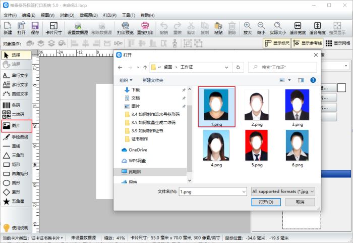 首先,我们整理照片,把所有的照片员工信息表的顺序一一对应好,放在一个文件夹中。点击左侧图片按钮,打开工作证需要的照片,选择第一张照片。