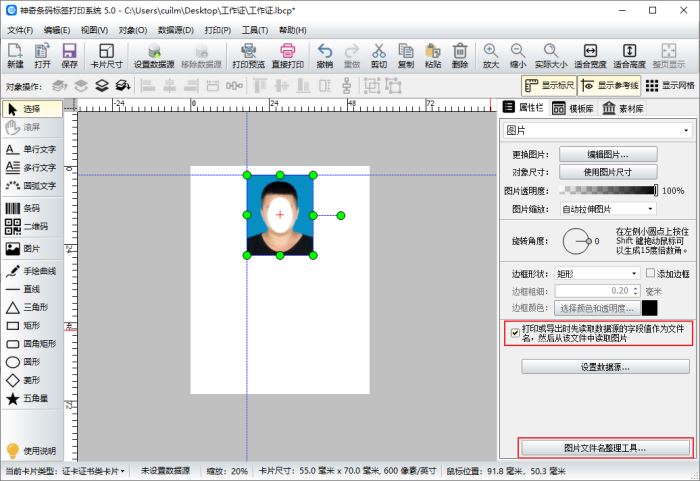 3、照片添加进画布,勾选打印或导出时先读取……,然后从该文件中读取图片,再点击图片文件名整理工具
