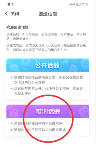 4、在【创建话题】页面内,点击【树洞话题】。