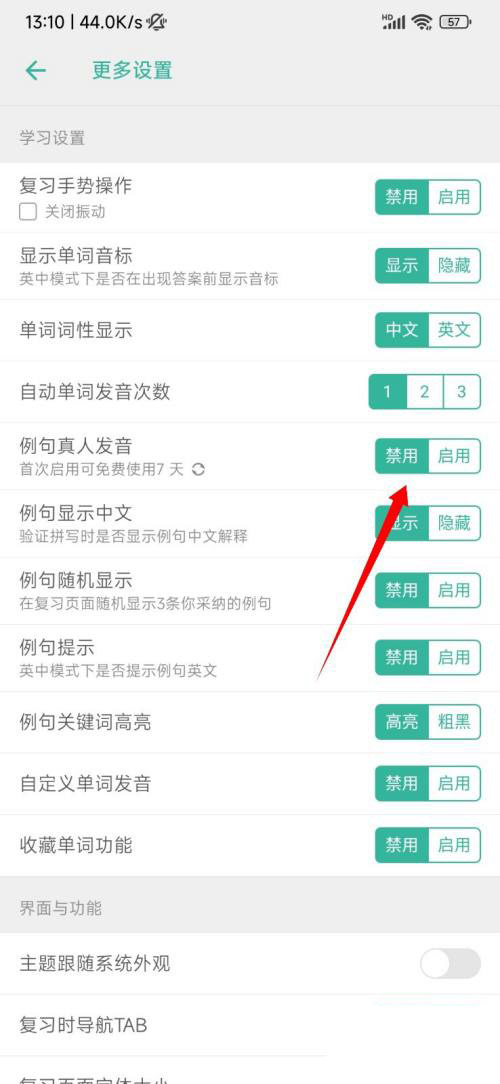 3、打开例句真人发音的开关即可