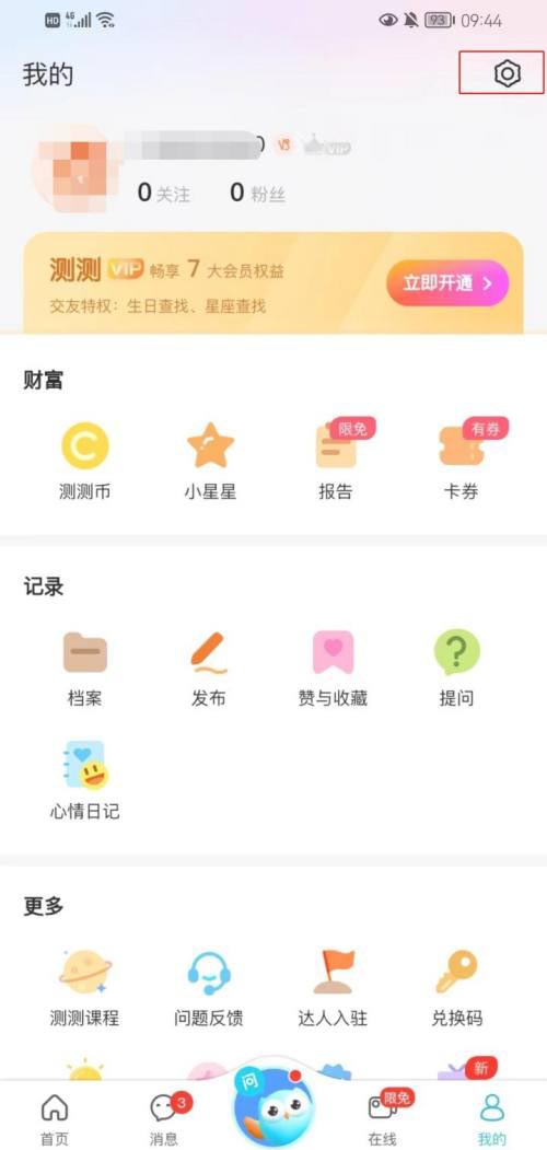 首先打开【测测】软件,选择下方【我的】点击右上角的【设置】选项
