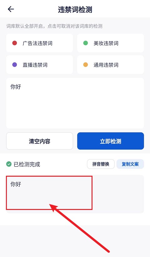 等待检测完毕,在下列文本框中就会出现标注好违禁的词汇信息(如图所示)