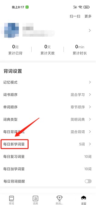 进入我的界面,点击【每日新学词量】。