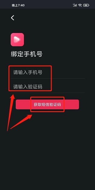 进入绑定手机号界面,输入手机号、验证码,点击【获取短信验证码】。