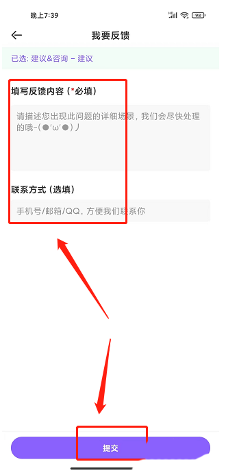 进入我要反馈界面,填写反馈内容、联系方式,点击【提交】。