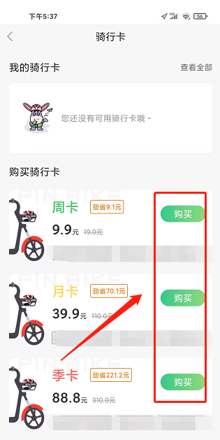 进入骑行卡界面,选择骑行卡套餐,点击【购买】。