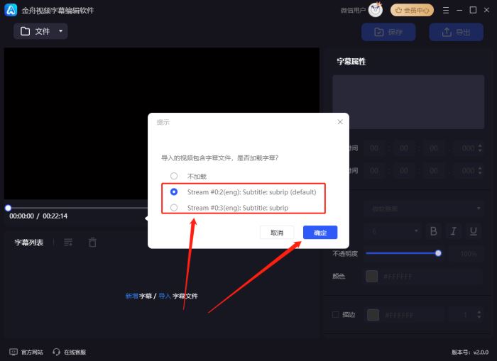 二、导入的视频带有字幕轨道,则会弹出以下提示窗口,勾选其中一个选项,点击“确定”即可;