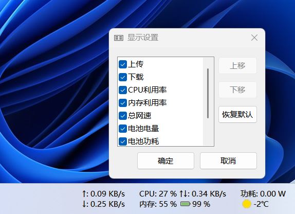 你也可以设置显示更多功能,比如电池功耗、总网速等。
