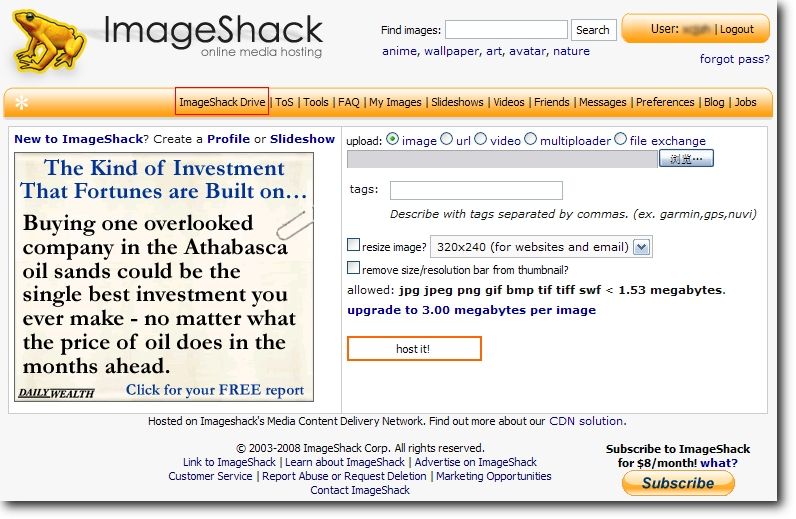 以前我知道的这个网站好像是个图片分享网站,因为打开速度很慢,又是外国网站,我没怎么关注,原来它已经有了Drive这个服务了,在首面点击Imageshack Drive就可以使用BT代LI下载了,但是要注册。