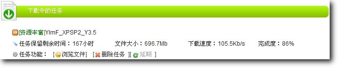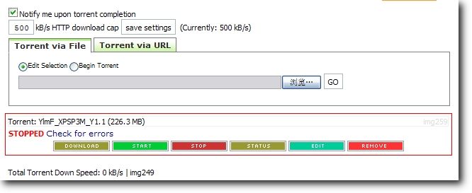 可以设置下载完毕后邮件提示,http下载时的速度上限,我设的是默认的500KB/s。BT下载的速度不错,初期就接近200KB/s的速度,而且任务下面的六个按钮很人性化,你可以自由选择怎么操作: