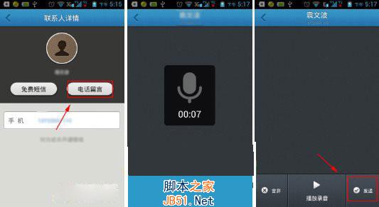 3、选择好好友时会出现免费短信和电话留言,打开电话留言,然后点击按住说话,说完以后松手,点击发送,这样对方就可以收到你的电话留言了。