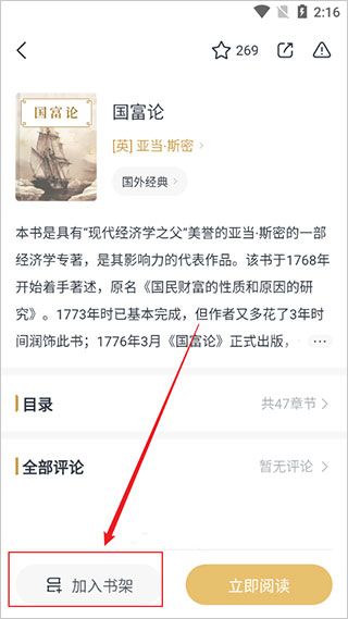 3、进入书籍介绍页面,再点击下方的【加入书架】。