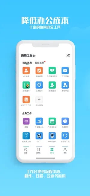 统─移动端各类业务入口。提供基于企业组织架构的IM沟通入口及基于统一管控的移动工作台,满足员工在移动端各类办公业务的使用需求