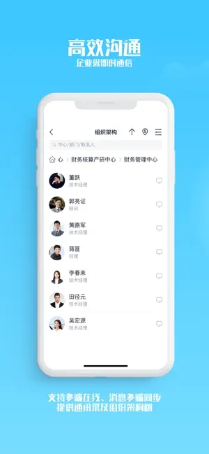 -支持即时消息、视频会议、直播、群发通知多种沟通方式-支持组织架构树、快速搜索同事和定位到组织架构树
