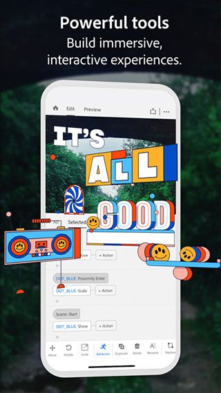 除此之外,Adobe Aero软件可以帮助用户在不方便使用电脑的情况下,只需要使用共享的专属链接就能够轻轻松松的查看自己作品完成程度,从而简化整个工作的流程,这样就可以加快自己的工作速度,可以说非常的方便便捷,当你在从事这类的工作,要记住的就是创造力和讲故事没有限制,你想如何增强现实取决于您自己的想象力和需求,但也需要一款这样的软件,所以快快来下载吧。