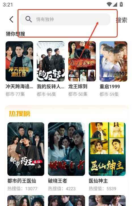 4、点击上方搜索框输入关键词,可以精准检索喜欢的短剧