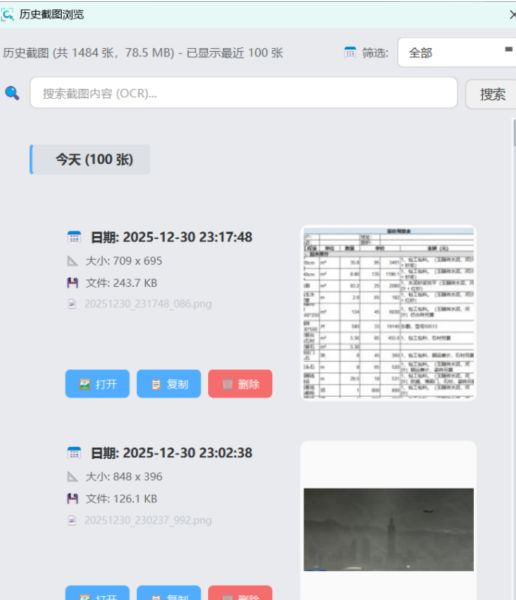 历史截图 - 每次截图自动保存,系统托盘一键查看历史