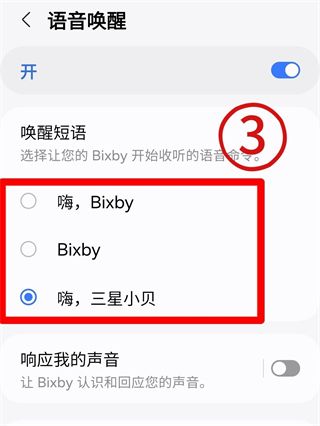 在「语音唤醒」界面,你可以选择“嗨,Bixby”、“Bixby”或更亲切的中文唤醒词“嗨,三星小贝”。根据个人喜好,选择最适合你的唤醒词(例如,图中选择了“嗨,三星小贝”)。