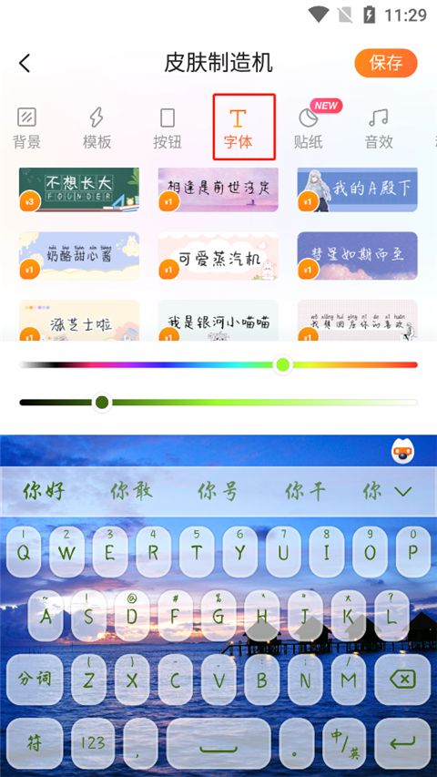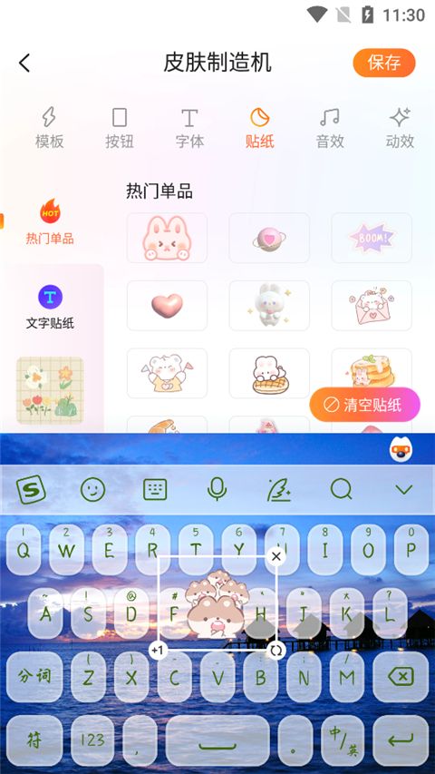 用户可以自义定自己键盘的背景、键位、按钮、字体、贴纸、音效、动态效果等元素,而且商城中也内置海量不同素材的类型,能够满足不同用户的皮肤需求。