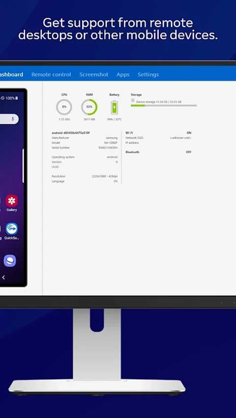 1、从Windows或Mac计算机获得移动设备支持!现在,您可以为您的移动设备接收远程技术支持了。技术人员可以进行对话、收发文件、查看设备信息、停止进程、推送WLAN设置等操作。