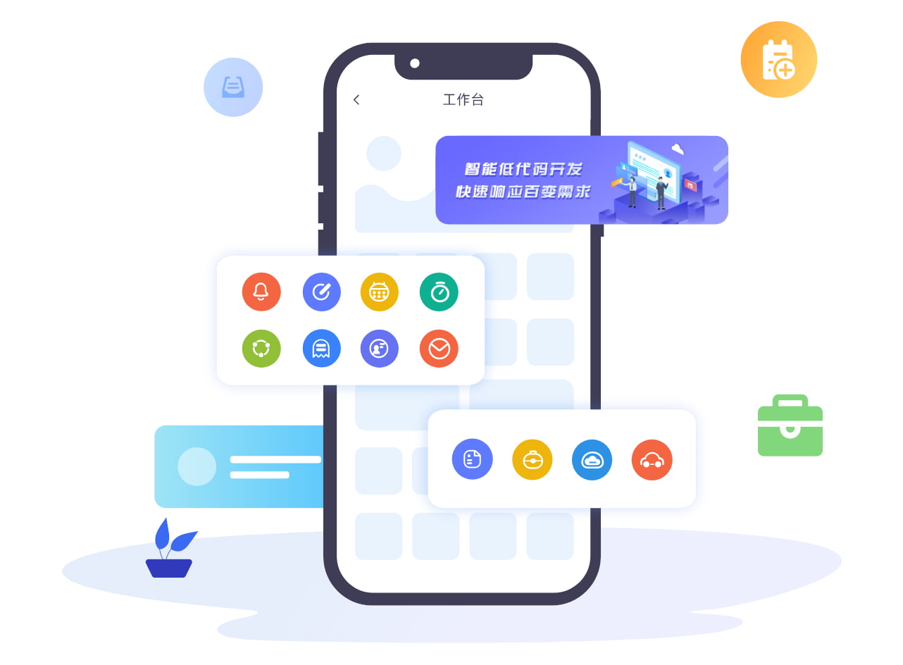 在工作台内可以集成采用H5技术开发的各种扩展应用,可以根据用户权限动态显示,可以设置自定义的工作台页面。