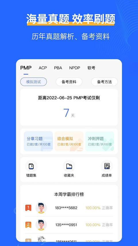 基于最新版PMBOK标准,提供PMP、ACP、PBA资格认证模拟题库,包括全真测试题库、考前冲刺题库,助力高效备考。