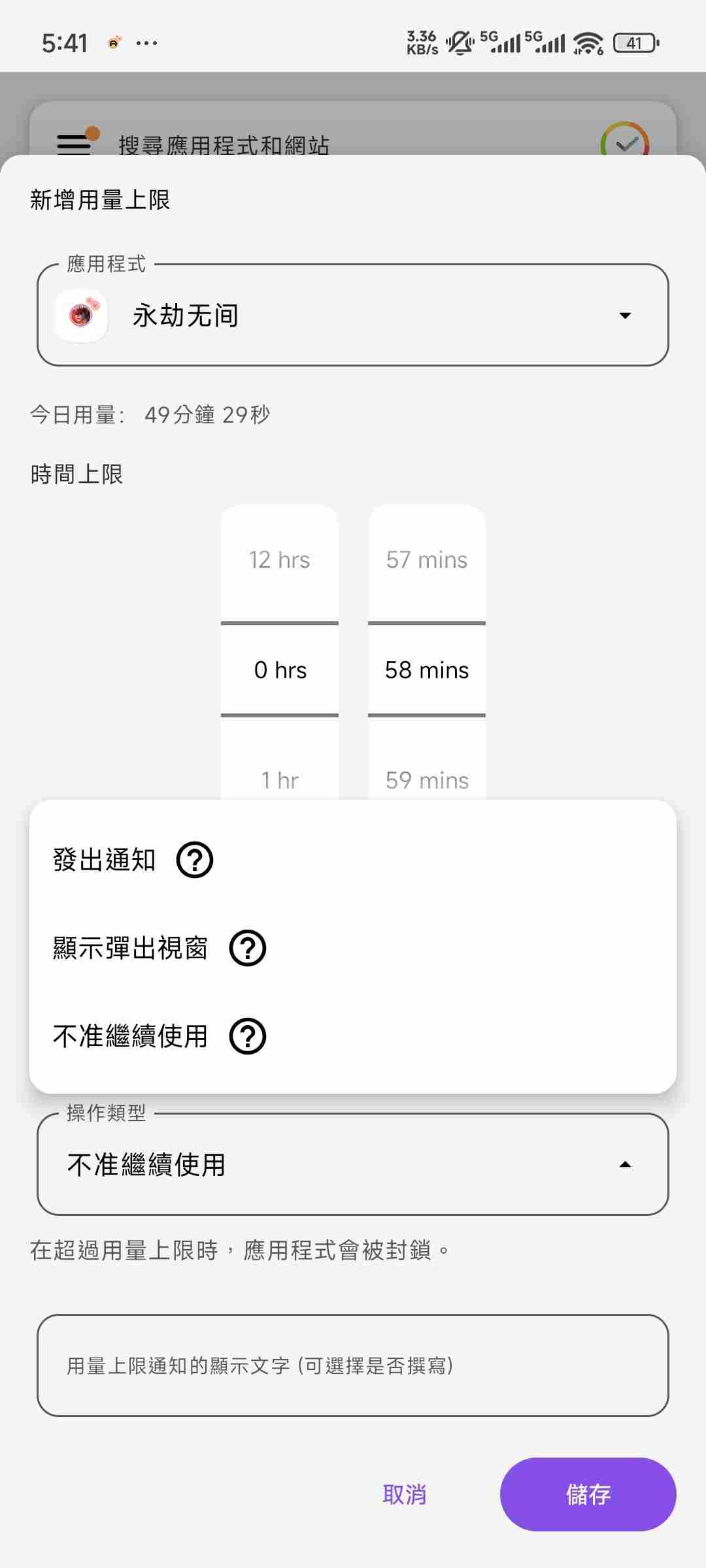 5、输入上限时间,选择【发出提醒、显示弹出视窗或者不准继续使用】点击储存就好了