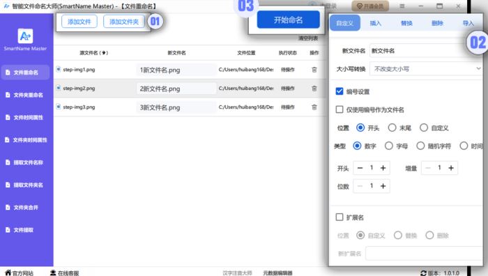 支持数字、字母顺序命名,或按顺序为多个文件名添加字母、数字编号