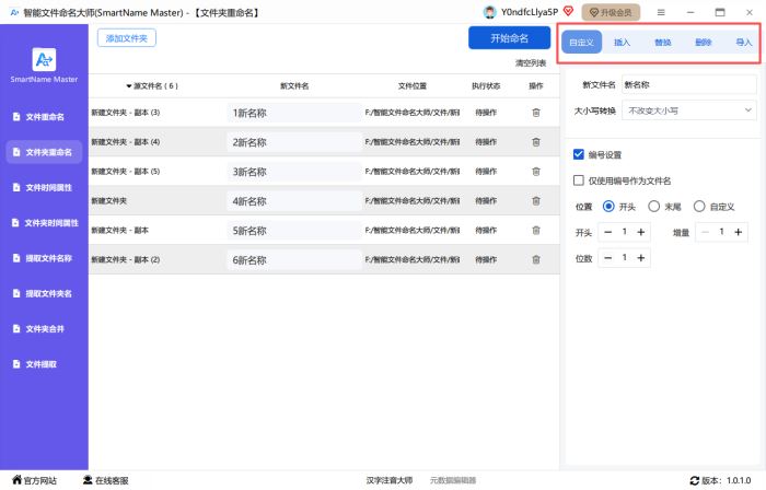 第二步、在右侧工作台中选择命名方式:自定义、插入、替换、删除、导入。