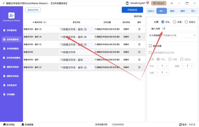 第三步、根据需要输入或插入新的文件名或字符,左侧可以预览新文件名。