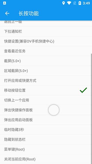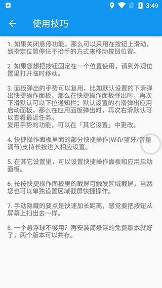 * 快捷操作面板 (包含电源键长按、音量调节、响铃模式调节、Wifi、蓝牙、自动旋转、屏幕常亮)您可以自定义悬浮按钮的外观,同时您也可以通过多种方式来隐藏悬浮按钮。更详细的设置,请参考“外观位置”。