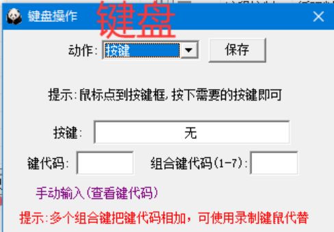 键 盘=>录制、按键、按下、放开、组合按键等